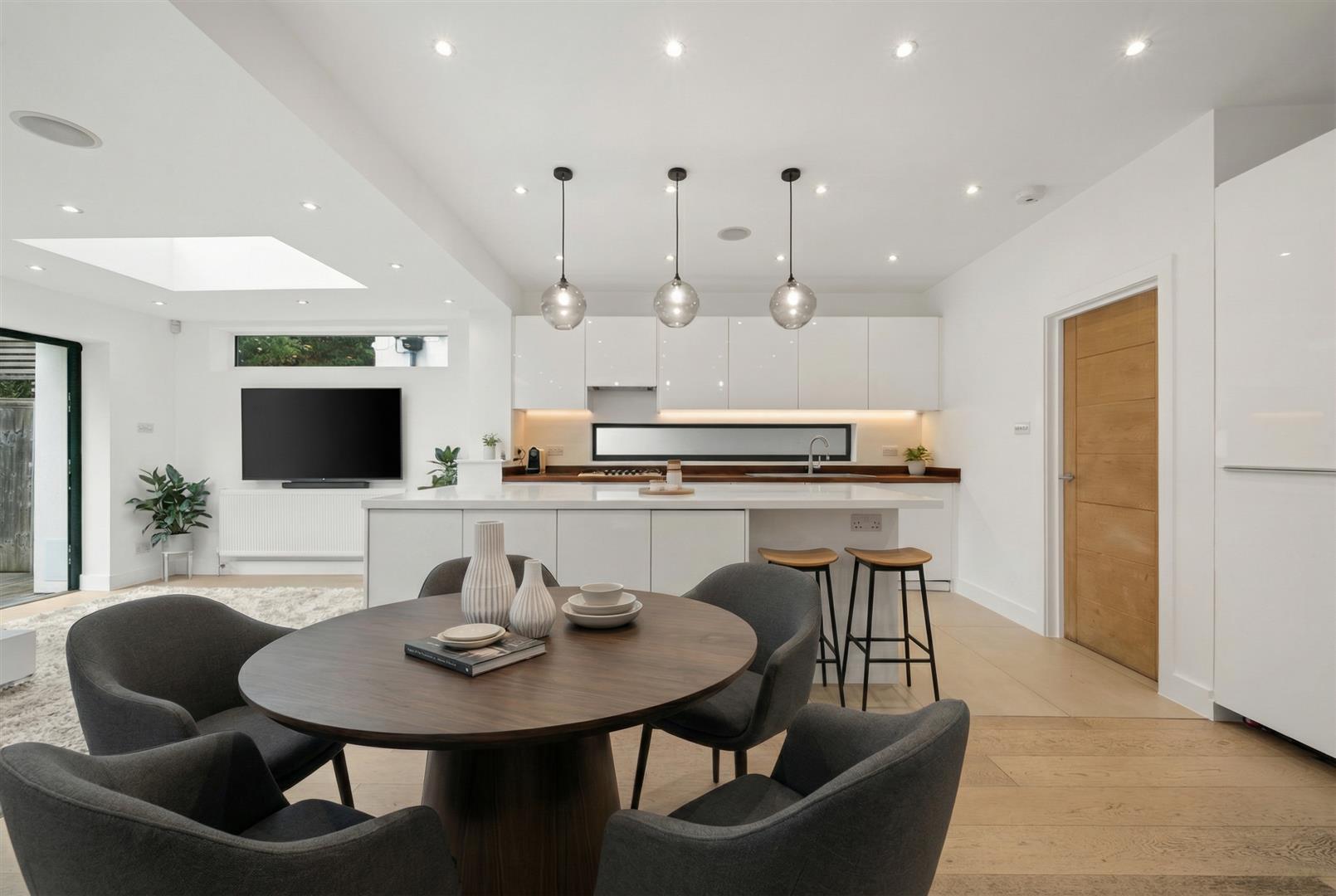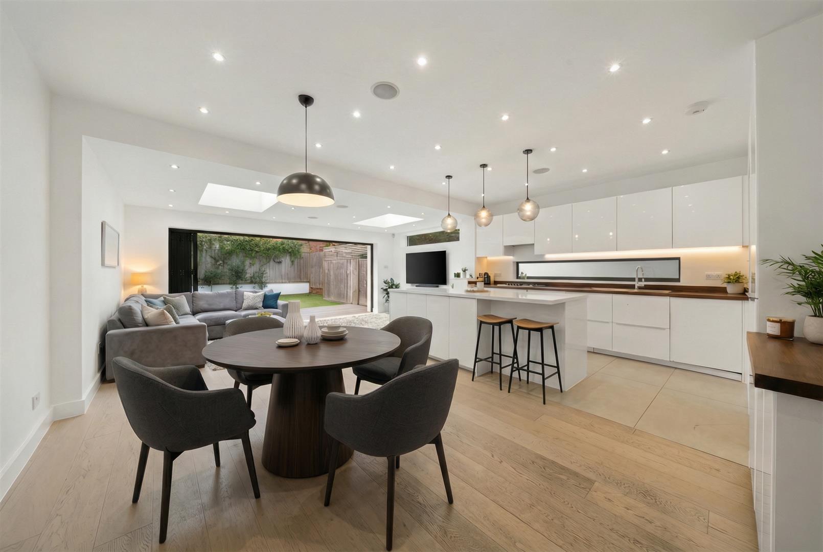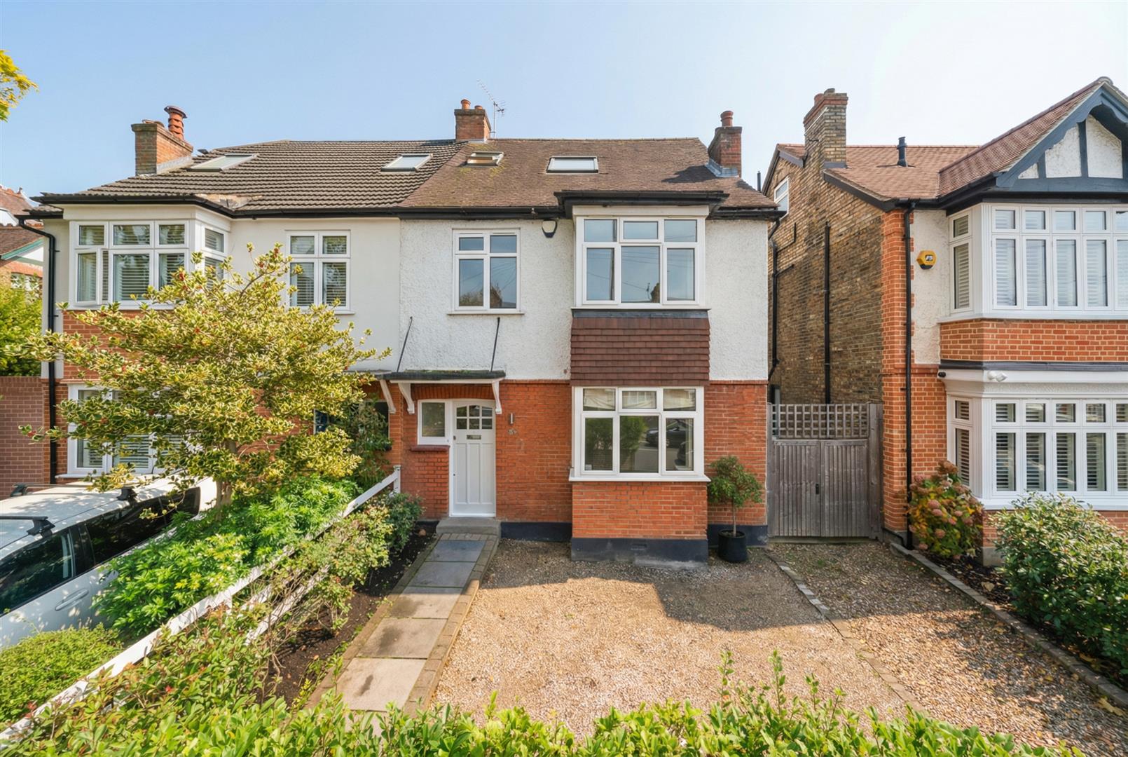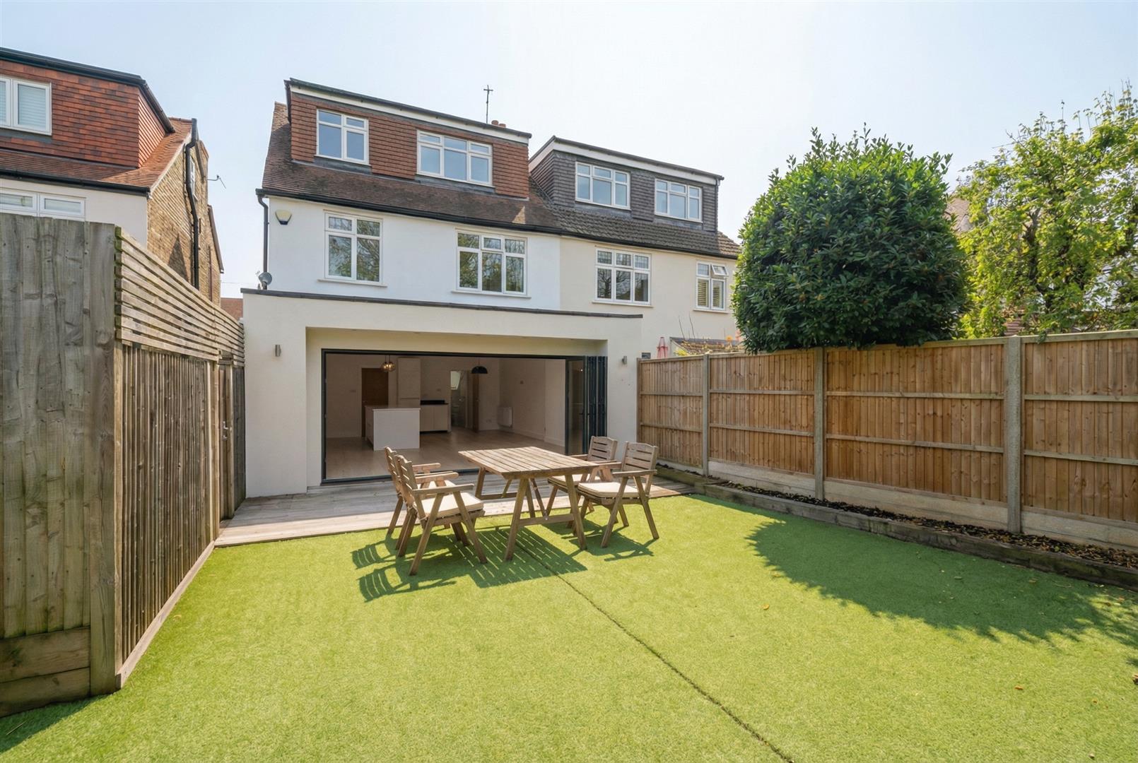 An attractive, halls-adjoining Edwardian home situated in an ultra-convenient location just moments on foot from the village centre, shops and station for services into London Waterloo. This substantial period property is ready to move into with a chain-free transaction and has recently been the subject of redecoration and new carpets. The layout is both contemporary and versatile and on the ground floor there is a spacious entrance hall, traditional front reception room, an expansive kitchen / breakfast / family room with bifolds to the garden, a utility room and cloakroom / WC. The first and second floors offer the choice of five individual bedrooms with a family bathroom and top floor en suite bathroom completing the picture. Externally, there is off road parking to the front and pedestrian side access through to a low maintenance rear garden with an area of decking and the remainder laid with artificial grass.